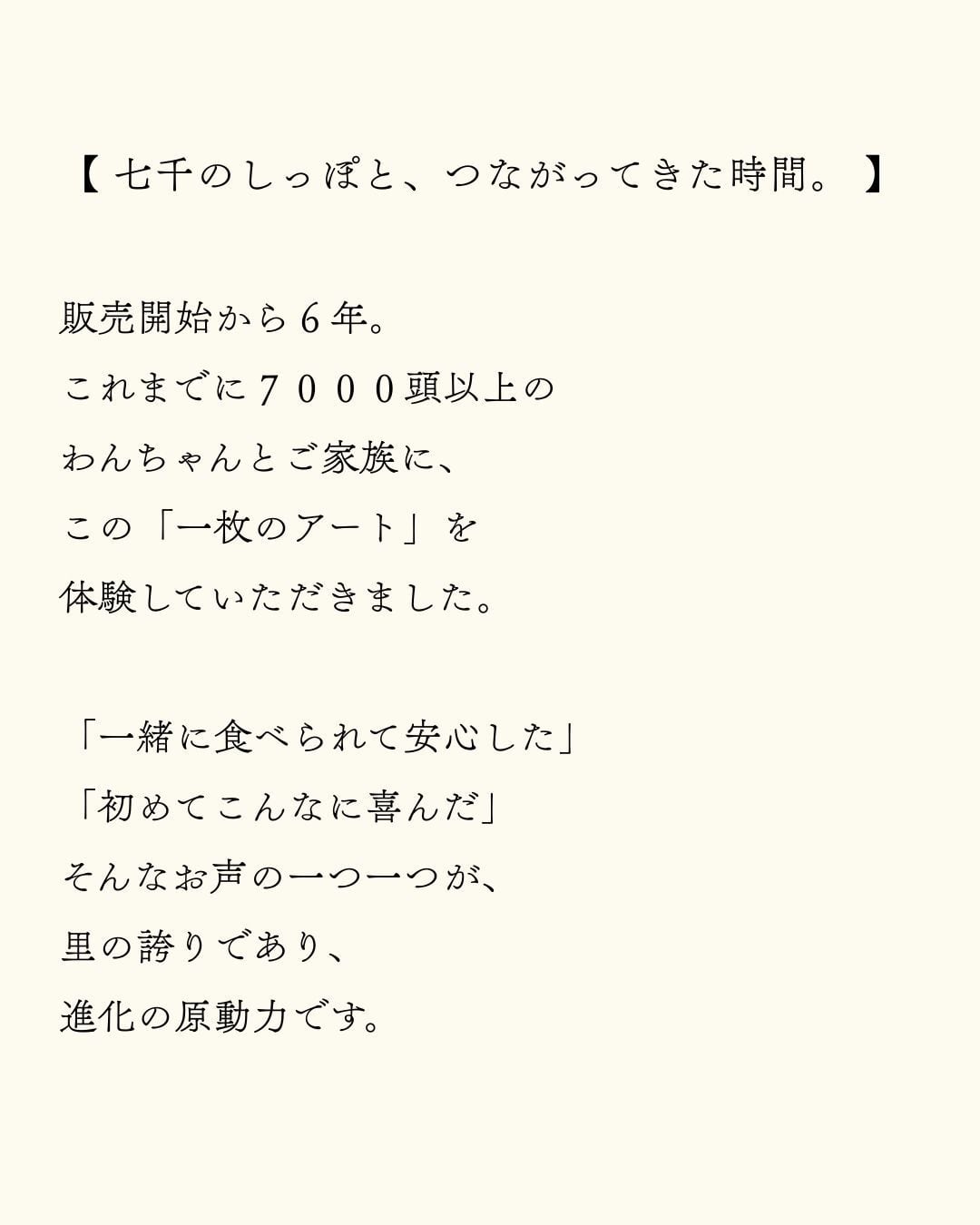 甘いね、と笑い合う。 砂糖はいらない。太陽と大地の力があればいい。 袋を開けた瞬間にふわりと香る、焼き芋のような甘い匂い。 これは、砂糖や香料で足したものではなく、**「素材そのものが持つ命の甘み」**です。 使用しているのは、たった3つの宝物だけ。 自然栽培のさつまいも(愛知県産) 自然栽培の馬鈴薯澱粉(北海道産) 伝統製法の手絞り菜種油(愛知県西尾・ほうろく屋) これらを、創業70年の技術で焼き上げただけの、嘘のないおやつです。 ■ アレルギーと戦うあの子へ。 この作品は、「お肉やお魚にアレルギーがあって、食べられるおやつが少ない」という切実な声から生まれました。 動物性食材を一切使わず、植物の恵みだけで作られているため、アレルギーやアトピーが心配なご家族にも、心からの安心をお届けします。 ■ 7,000頭と決めた「優しさのカタチ」。 5年間で約7,000頭のわんちゃんに試食してもらい、たどり着いたのは**「パキッと割れて、口の中で優しく溶ける」**食感です。 硬すぎず、柔らかすぎず。 小さなお子様からシニアの方まで、家族みんなで「美味しいね」と分け合える、ふりり自慢のユニバーサルデザインです。 仕事や家事で疲れた時、愛犬と一緒にひとかじりしてみてください。 身体に染み渡る素朴な甘さが、心のコリまでほぐしてくれますよ。 【こんなパートナー(愛犬・ご家族)におすすめ】 動物性タンパク質(肉・魚)のアレルギーがあるわんちゃん 砂糖や添加物を避け、自然な甘みを楽しみたい方 アトピーや皮膚の健康が気になる方 ほっとする甘さで、愛犬とティータイムを共有したい方 【商品詳細】 名称: with family さつまいも(自然栽培) 内容量: 16g(1袋) 原材料: さつまいも(愛知県産・自然栽培) 馬鈴薯澱粉(北海道産・自然栽培) 菜種油(愛知県西尾産・伝統徳川製法「ほうろく屋」手絞り) サイズ: 袋:約 縦10.5cm × 横11cm × 厚さ2cm 1枚あたり:約1〜2cm(ひとくちサイズ) 賞味期限: 発送時に2ヶ月以上ある商品をお届けします 原産国: 日本 【栄養成分表示(1袋 16gあたり)】 理学療法士の視点:低タンパク・低塩分。腎臓への負担を配慮したい子や、エネルギー補給が必要な子にもおすすめです。 エネルギー: 81.4kcal たんぱく質: 0.24g 脂質: 0.87g 炭水化物: 18.5g 食塩相当量: 0.03g (日本食品標準成分表をもとにした目安です) 【安心してお召し上がりいただくために】 本商品は**「食品として製造」**しております。ペットフードではなく、ご家族みなさまで安心してお楽しみいただけます。 祖父・父から受け継いだ焼き機で、その日の湿度に合わせて焼いているため、焼き色や形に愛おしい個体差があります。 【ご注意(アレルゲン・製造環境)】 本製品は、同一工場内で「えび」を含む製品も製造しています。 (※植物性原料のみを使用していますが、重篤なアレルギーをお持ちの方はご注意ください)