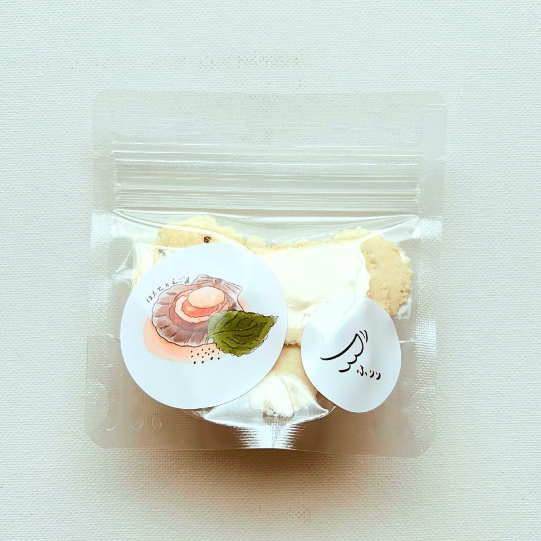 原材料:馬鈴薯澱粉(北海道産)・ホタテ貝柱エキス(北海道産)・菜種油(愛知県産)・えごま(富山県産)