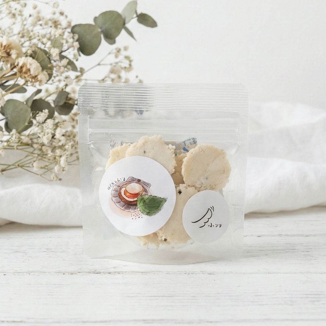 袋を開けた瞬間、北海道の海風のようなホタテの甘い香りが広がります。 そして噛むほどに、プチプチと弾ける「えごま」の香ばしさ。